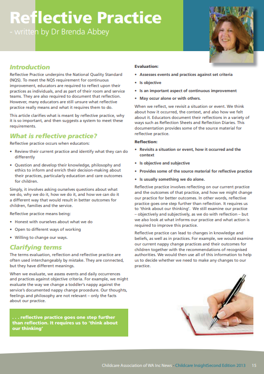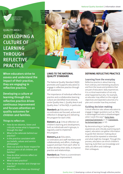 < Return to categories Knowledge BankReflective Practice VEYLDF Practice Guide: Reflective Practice Reflective Practice: Making a commitment to ongoing learning Developing a Culture of Learning Through Reflective Practice Reflective Practice by Dr Brenda Abbey Cultural Knowledge Story Early Years Learning Practice Guide