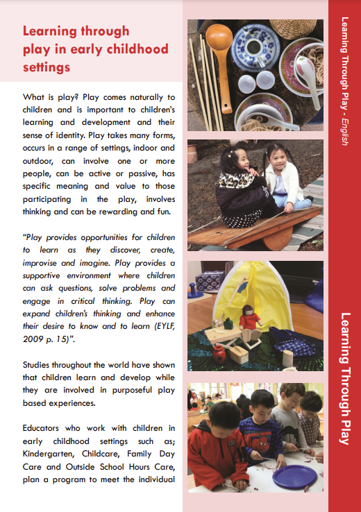 < Return to categories Knowledge BankEarly Childhood Pedagogy and Practice Learning through play (UNICEF) Learning through play in early childhood settings (fkaCS) Finding the balance: Play-based learning and intentional teaching New resources on challenging behaviours (DET, 2023) Active Outdoor Play Leading Playbased Pedagogy Theory of Loose Parts Outdoor play synthesis